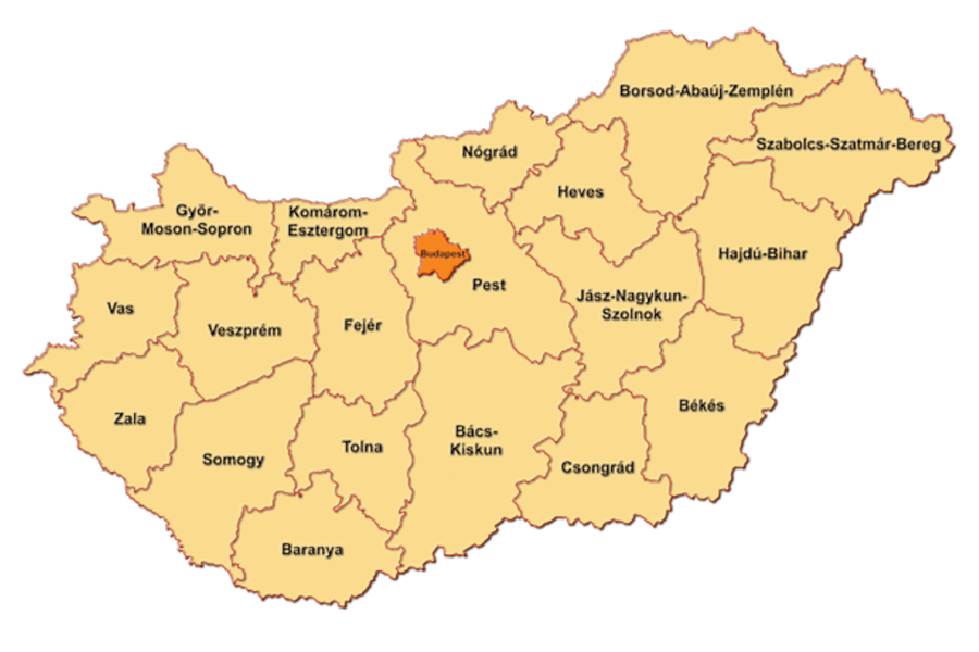Győr Komárom Vas Zala Somogy Veszprém Baranya Tolna Bács Fejér Budapest Pest Nógrád Heves Jász Csongrád Békés Hajdú Szabolcs Borsod